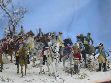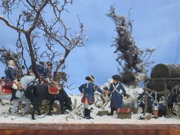 Das Diorama zeigt Friedrich den Großen mit den Generälen Zieten, Driesen und Winterfeld, sowie einigen anderen hohen Infanterie-Offizieren